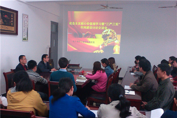本网讯(陈丽)4月23日中午,电子通信工程学院党总支召开社会主义核心价值观学习暨“三严三实”作风建设交流讨论会。会议由电子通信工程学院党总支副书记操宏华主持,电子通信工程学院中层管理人员、各支部书记及全体党员教职工参加了会议。