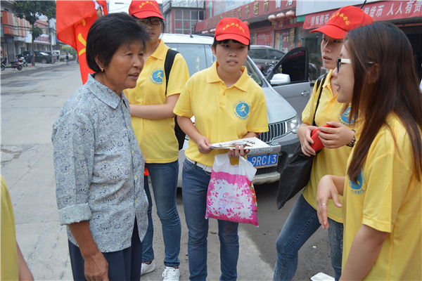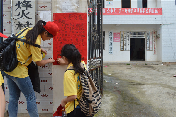当然,在行走的路上也遇到了一些难题,有的乡民把队伍误认为是旅游团的,也有的认为是需要收费的教学活动,拒绝同学们的宣传。此外,也引起当地办暑假班教学人的不满,小镇的路七弯八拐,面对陌生的环境,队员们很容易走错路。“虽然在宣传的时候有点小插曲,村民们说的又是当地的方言,给我们的宣传增加了不少困难,但我们还是很耐心地跟他们解释清楚,道明我们的来意。”组长林程君说。