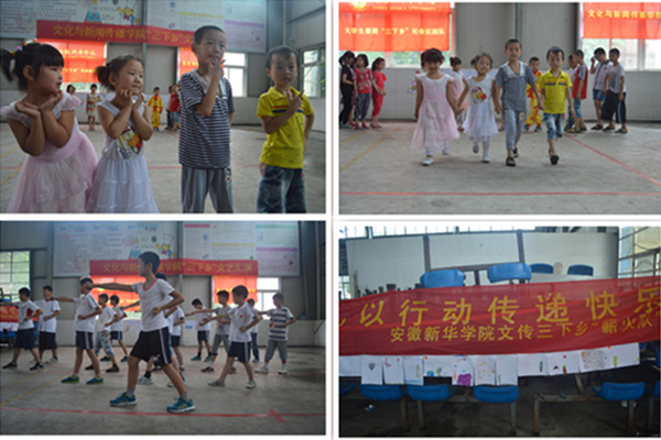本网讯(学生记者  康引兰  摄影   陈伟、林程君、宣政)7月5号,“薪火”实践小分队在安庆市宿松县凉亭镇为期一个礼拜的暑期三下乡实践活动接近尾声。当天,小老师们和学员们举办了一场离别前的文艺汇演,一共13个节目,此次汇演还邀请了凉亭中学的老师表演广场舞作为开场秀,向当地凉亭镇的父老乡亲展示几天的教学成果。本次活动还得到宿松县电视台的支持,特派记者前来采访。