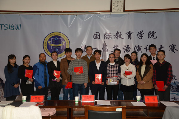 本网讯(王海峰)12月5日晚,国际教育学院首届英语演讲比赛决赛在图书馆举行。来自2014级经济与金融专业喻馨怡同学获得一等奖,包志轩、李超等同学分获二等奖、三等奖及优秀奖。国际教育学院院长范东生、宁宇平等老师及外教Elijah担任评委。