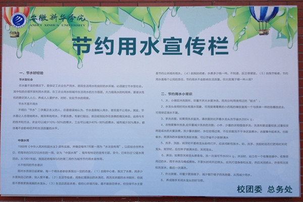 本次活动主要运用张贴节约用水宣传栏,悬挂节水知识宣传条幅,循环播放节水宣传口号电子显示屏等形式,营造节水宣传氛围,加大节水宣传力度。同时,为将节水工作落到实处,校总务处每日安排维修人员分责任区定点巡查,加强供水管网的检修维护。宣传周期间,共计更换水龙头及节水便器100余件,查出漏水点2处并及时进行维修。