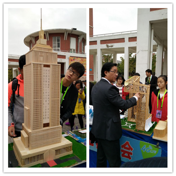 新华集团副总裁、学校执行董事陆真,副校长杨世国,美国凯泽大学副校长杨湛君,土木与环境工程学院执行院长朱兆健亲临现场观展。本次展出了包括“小蛮腰”“钟鼓楼”“帝国大厦”“两琴相悦”“中国馆”在内的42组作品。其中,作品“盼桥”受到了美国凯泽大学副校长杨湛君的青睐,他亲自踏上模型,体验了桥梁的承载能力。观展领导、教师对参展的模型赞不绝口,同时也提出了一些宝贵意见。同学们在观赏之余,驻足咨询有关模型制作的过程与材料等问题,现场气氛非常活跃。