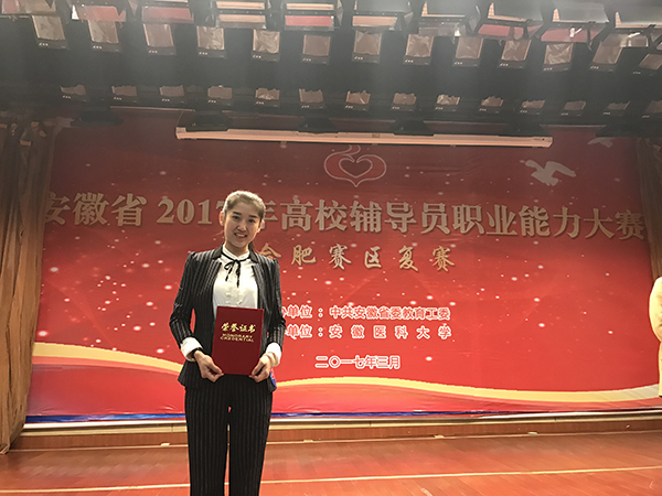 本网讯(通讯员:王强亚)为推动高校辅导员队伍专业化、职业化发展,促进辅导员交流学习,进一步提高辅导员工作能力和育人水平,3月11日至13日,由省委教育工委主办,安徽医科大学承办的“2017年安徽省高校辅导员职业能力比赛复赛(合肥赛区)”顺利举办,永利官网辅导员董甜甜获得三等奖的好成绩。