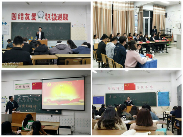 会上,商学院团总支书记带领团干深入学习了共青团改革相关精神和十九大精神。会后,各团支部团干部在深入学习十九大系列精神之后,积极开展各类活动,形式多样,内容新颖,主要以视频学习、报告解读、分组讨论、主题活动等为主。其中2017级市场营销本1班团支部开展主题为“‘回望党史,仰望星空”特别活动—祖国,我想对你说”和“激情满怀观盛会,信念坚定跟党走”系列活动;2016级物流管理本2班团支部组织观看爱国视频《大国外交》,回望中华民族的外国历程,激励青年人珍惜当下,砥砺前行;2015级人力资源管理本2班团支部积极学习新党章,号召团员青年主动学习,以党的知识武装头脑;2016级物流工程本1班团支部通过开展十九大相关视频学习,加深了对十九大精神的认识。