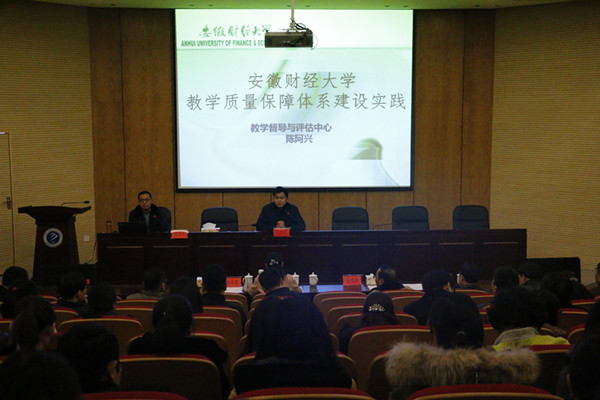本网讯(通讯员:刘雪,摄影:金政)12月20日下午,永利官网在学术报告厅举办教学质量监控与审核评估专题培训。安徽财经大学教学督导与评估中心主任陈阿兴教授应邀来永利官网作题为《教学质量保障体系建设实践》的专题讲座。校长石秀和,副校长李金星、王丽,校长助理朱兆健,各行政部门、直属单位负责人,各教学单位教学质量监控领导组全体成员,教务处、评建办、督查督导处、教学质量监控办公室全体人员参加了此次讲座。讲座由朱兆健主持。