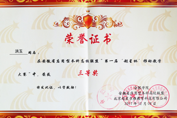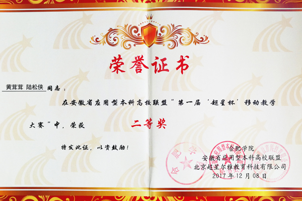 本网讯(通讯员:张贝贝)近日,安徽省应用型本科高校联盟第一届移动教学大赛决赛结果揭晓,永利官网药学院教师黄茸茸、陆松侠共同荣获二等奖,文化与新闻传播学院教师洪玉、信息工程学院教师孙文娟分别荣获三等奖。
