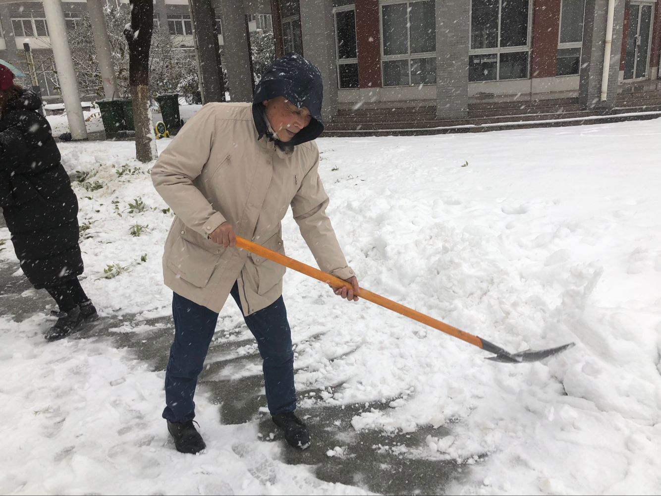 最后,余立新带领全体党员参加扫除积雪活动,党员们顶着风雪,拿起铁锹,铲起厚厚的积雪。