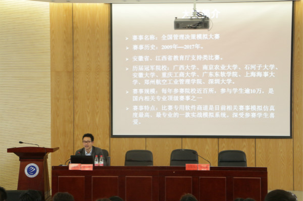 培训主要分为大赛介绍及仿真模拟训练两个部分。袁军详细地介绍了大赛的基本情况,并解释了参加创新创业比赛的重要性及其意,旨在帮助参赛学生更好地学习和运用管理学的核心知识点,培养学生们管理、决策以及执行能力,提高学生发现问题,解决问题的能力,同时,提高学生的情商、逆商和沟通能力,为职业发展提供战略支撑。袁军用幽默诙谐的语言介绍了比赛中涉及到的商业基础知识和对行业的预测方法,同学们纷纷表示受益匪浅。