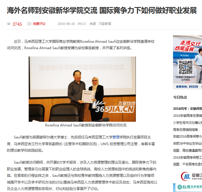 中国教育在线、UC头条:马来西亚理工大学Roselina Ahmad Saufi教授来yl7703永利官网交流访问