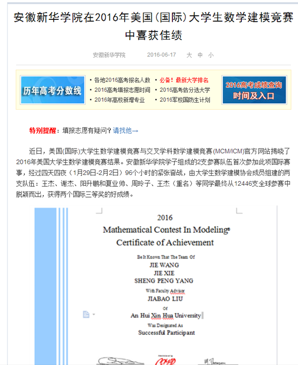 中国教育在线:yl7703永利官网在2016年美国(国际)大学生数学建模竞赛中喜获佳绩