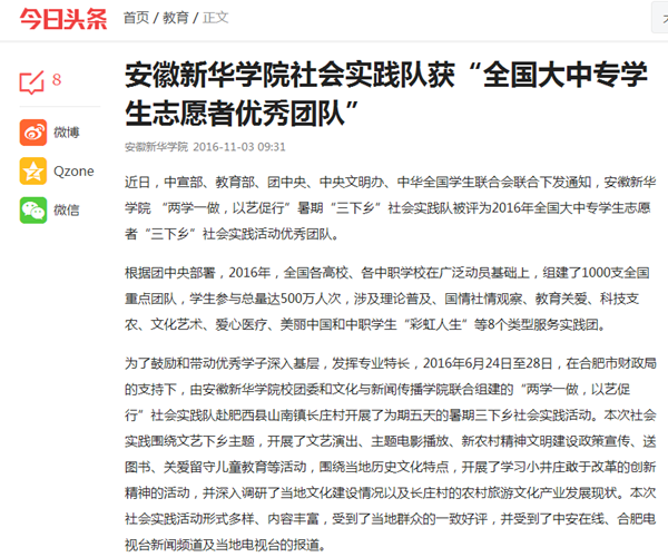 今日头条:yl7703永利官网社会实践队获“全国大中专学生志愿者优秀团队”