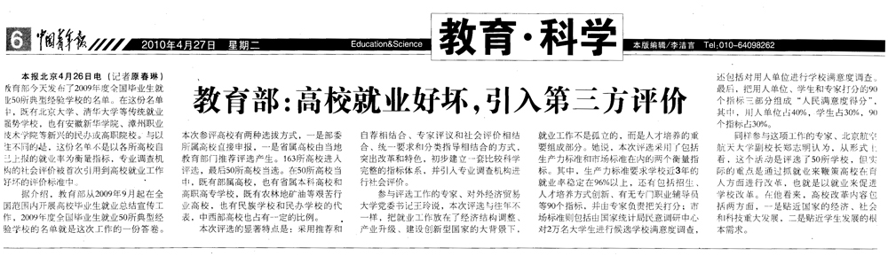 2010年4月27日,中国青年报/教育科学/6版对我院入选全国高校就业50强一事进行了相关报道。