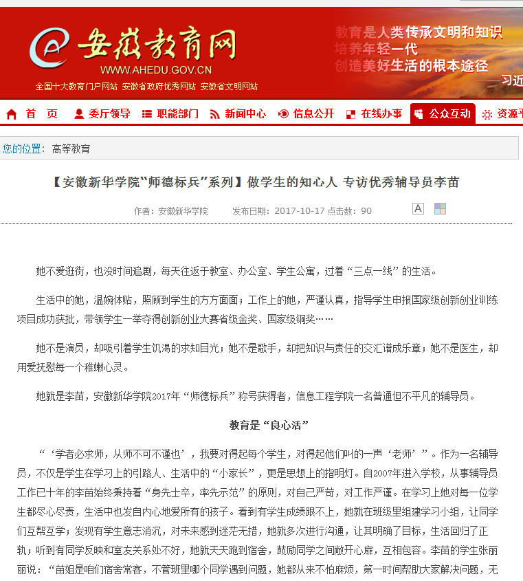安徽教育网:【yl7703永利官网“师德标兵”系列】做学生的知心人 专访优秀辅导员李苗