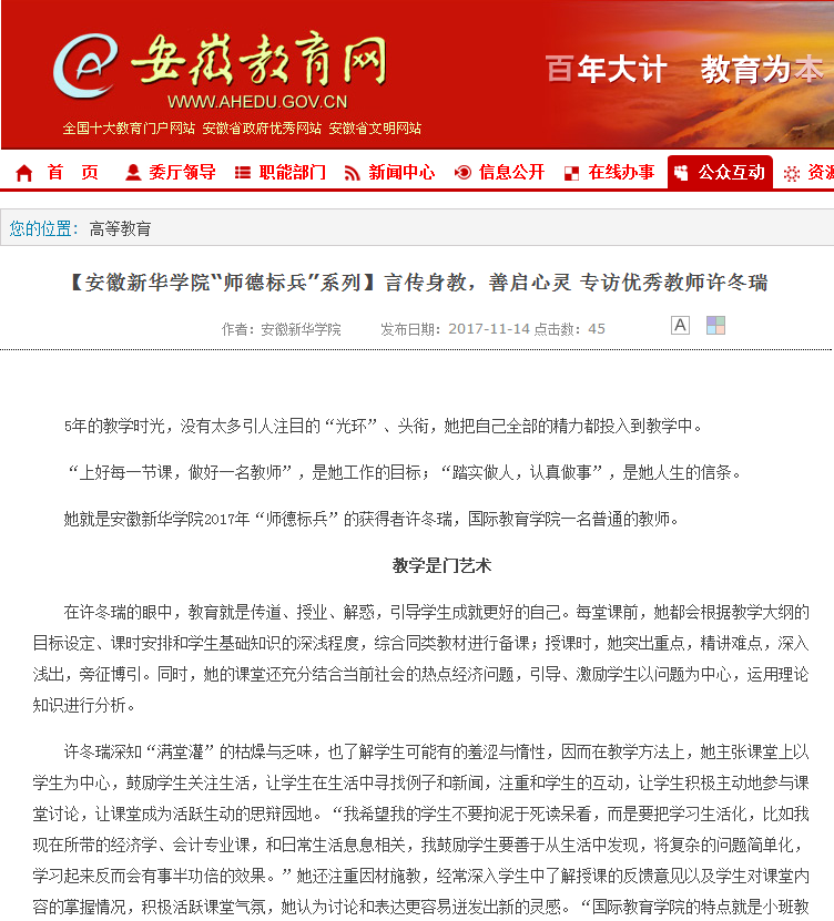 安徽教育网:【yl7703永利官网“师德标兵”系列】言传身教,善启心灵 专访优秀教师许冬