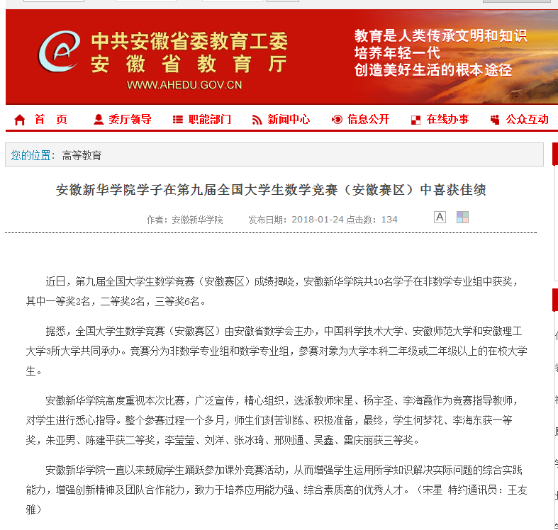 安徽教育网:yl7703永利官网学子在第九届全国大学生数学竞赛(安徽赛区)中喜获佳绩