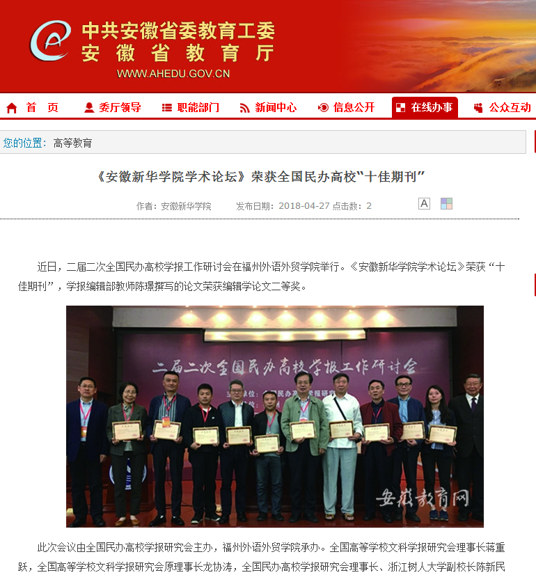 安徽教育网:《yl7703永利官网学术论坛》荣获全国民办高校“十佳期刊”