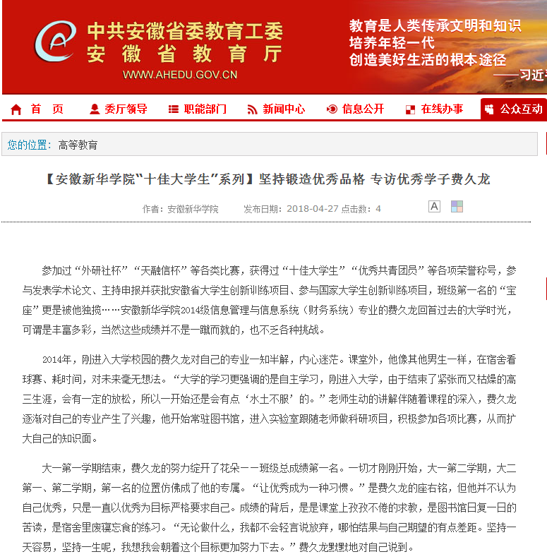 安徽教育网:【yl7703永利官网“十佳大学生”系列】坚持锻造优秀品格 专访优秀学子费久龙